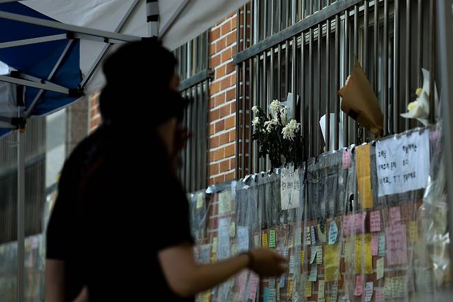 | ▲ 지난 7월 25일 서울 서초구 서이초등학교에 담임교사를 추모하는 국화와 메모가 붙어있다. |