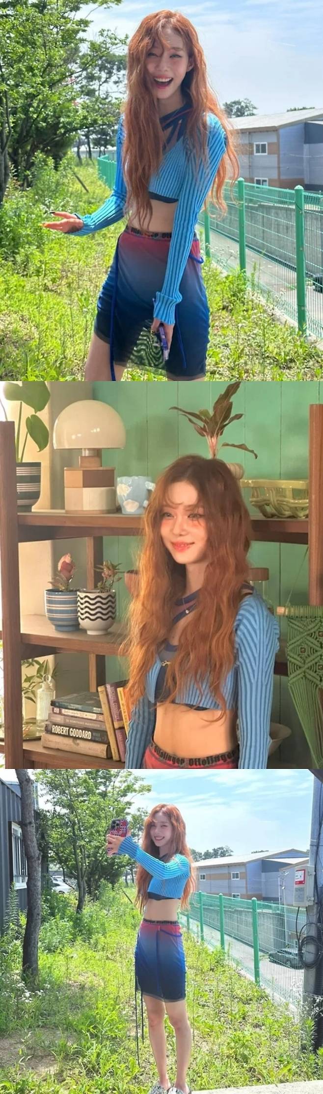 사진에서 윈터는 독특한 디자인의 브라톱에 짧은 하늘색 볼레로를 입고 카메라를 향해 화사한 미소를 지었다.