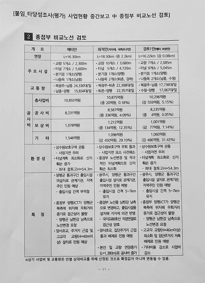한편 여현정 양평군의원은 해당 보고서에서 국토부가 강상종점안을 '최적안'으로 표기하며 그 옆으로 '지자체, 국회 요구안'이라고 표기해 둔 부분을 문제 삼았다.