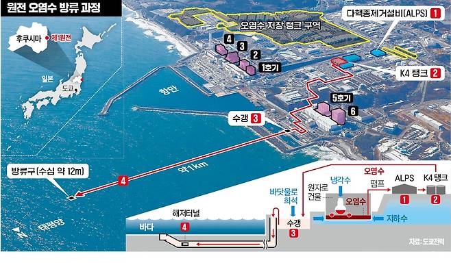 상류수조를 채운 오염수는 깊이 16m의 하류수조를 거쳐 해저 파이프로 흘러간다. 해저 파이프는 원전 앞바다 1㎞ 앞까지 설치돼 있다. 수심 12m에 설치한 방류구를 통해 최종적으로 바다로 흘러간다.