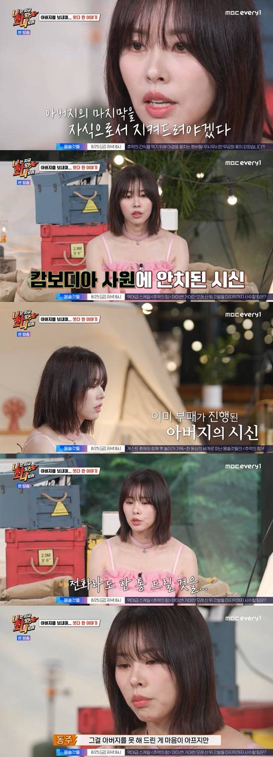 이후 반려견 장례식까지 치룬 그는 "강아지를 소독하고 수의 입히고 화장하는데 한 번 더 거기서 무너졌다. 강아지를 보내는데 너무 깨끗한 곳에서 아름답게 사진까지 보내는데 아버지의 캄보디아 낙후 장례식장이 오버랩 됐다. 자식으로서 강아지도 이렇게 보내는데 아버지는 못해드려 아팠다 .제가 결정할 부분이 아니라 딜레마로 힘들었다"고 토로했다.