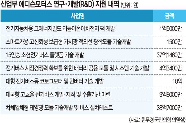 한무경 국민의힘 의원실에 따르면 산업부는 2017년부터 지난해까지 한국산업기술평가원과 한국에너지기술평가원을 통해 에디슨모터스에 모두 7건의 연구개발 사업을 맡기면서 100억원에 달하는 예산을 지원했다.