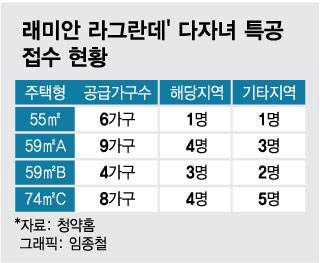 사실상 다자녀 특공은 인천·경기 거주자가 서울 아파트 청약에 당첨될 수 있는 유일한 기회다. 당장 '래미안라그란데' 1순위 청약만 봐도 전 주택형이 1순위 해당지역에서 마감됐다. 인천·경기 등 기타지역에서 청약한 8500여명에게는 아무런 기회도 주어지지 않는 셈이다.