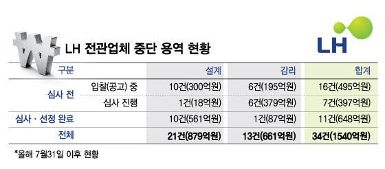심사 이전 단계에 있는 업체들은 법적으로 문제가 없을 것으로 예상되나, 심사·선정 단계를 마친 업체들은 다르다. 아직 계약서를 작성하지 않았더라도 낙찰자 지위에 있기 때문에 손해배상 청구 소송이 가능하다. 심사·선정을 이미 마친 설계 용역은 10건(561억원), 감리용역은 1건(87억원)으로 총 11건이다.