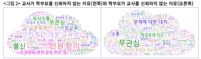 경기도교육연구원은 지난해 1월 ‘학부모와 교사 간 상호 신뢰 향상 방안’이라는 연구 보고서를 냈다. 초중고 학부모 5538명과 교사 966명에게 서로를 신뢰하거나 불신하는 이유와 상호 간 신뢰를 높일 수 있는 방안을 묻고 서술형 답변에 나타난 단어의 빈도를 분석해보았다. 교사에게 학부모를 신뢰하지 않는 이유를 물었을 때 많이 나타난 단어는 ‘민원·항의’ ‘이기적인’ ‘불신’ ‘의사소통’ 등이다. 학부모는 ‘무관심’ ‘문제에 대한 대처’ ‘소통’ 등을 거론하며 교사를 신뢰하지 않는 이유를 설명했다(〈그림 2〉 참조).