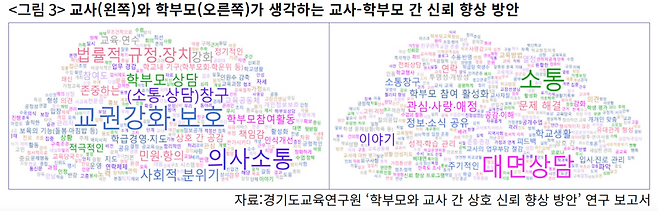 교사-학부모 간 신뢰 향상 방안을 물었을 때도 교사는 ‘교권 강화·보호’와 ‘의사소통’ ‘(소통·상담) 창구’를 주로 이야기했고 학부모는 ‘대면 상담’ ‘소통’ ‘이야기’ ‘관심·사랑·애정’을 자주 언급했다(〈그림 3〉 참조). 학부모는 갈구하고 교사는 부담스러워한다는 간극은 포착되지만, 어쨌든 ‘소통’이란 것을 빼놓고 신뢰 회복을 논할 수 없다는 사실을 학부모와 교사 양쪽 모두 알고 있었다.