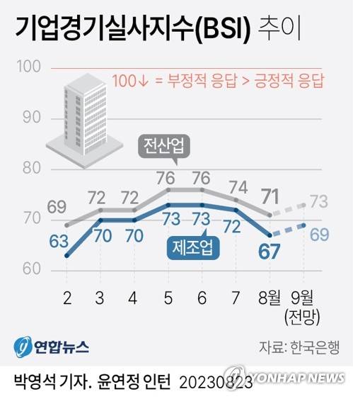 (서울=연합뉴스) 박영석 기자 = 한국은행이 23일 발표한 '8월 기업경기실사지수(BSI) 및 경제심리지수(ESI) 조사 결과'에 따르면 이달 제조업 업황 BSI는 전월보다 5포인트(p) 하락한 67을 기록했다. 지난 2월(63) 이후 6개월 만에 가장 낮은 수준이다.