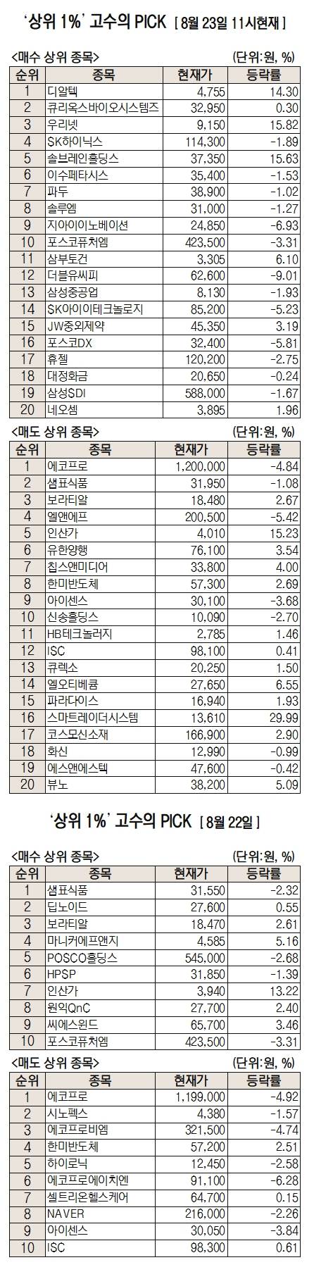 미래에셋증권은 자사 고객 중에서 지난 1개월간 수익률 상위 1% 투자자들의 매매 종목을 집계해 실시간·전일·최근 5일 기준으로 모바일트레이딩시스템(MTS)상에서 공개하고 있다. 이 통계 데이터는 미래에셋증권의 의견과 무관한 단순 정보 안내이며, 각각의 투자자 개인에게 맞는 투자 또는 수익 달성을 보장하지 않는다. 또 테마주 관련종목은 이상급등락 가능성이 있으므로 유의해야 한다.