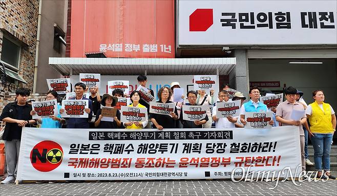 평화나비대전행동과 대전시민사회단체연대회의, 진보정당 등은 23일 오전 대전 중구 은행동 국민의힘대전시당사 앞에서 기자회견을 열고 "일본 정부는 핵폐수 해양투기 계획을 즉각 철회하라"고 촉구했다.