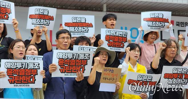 이들은 또 기자회견문을 통해 "일본 정부는 과거 전쟁범죄에 이어, 핵폐수를 바다에 투기하여 국제해양범죄를 저지르려 하고 있다"며 "이것은 인류재앙을 부르는 반인륜적 결정으로, 해양생태를 파괴하고, 대한민국 국민들의 생명안전을 위협하는 범죄행위로 우리는 일본 정부가 핵폐수 해양투기 계획을 즉각 철회할 것을 촉구한다"고 밝혔다.