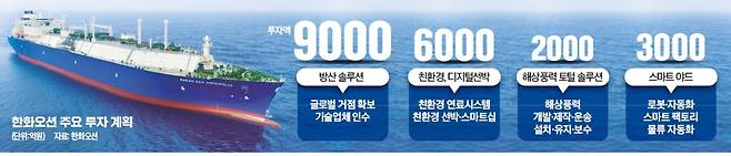 한화오션은 방산 외에 선박시장 환경 규제 강화에 따라 친환경 추진 시스템과 운반선 등을 개발하는 데 6000억원을 투자하기로 했다. 탄소 배출이 적은 암모니아·수소 기반 친환경 연료 추진 시스템 개발에 집중할 계획이다. 이와 함께 완전자율운항(레벨 4)이 가능한 스마트십 기술도 이번 투자를 통해 확보한다는 계획이다.
