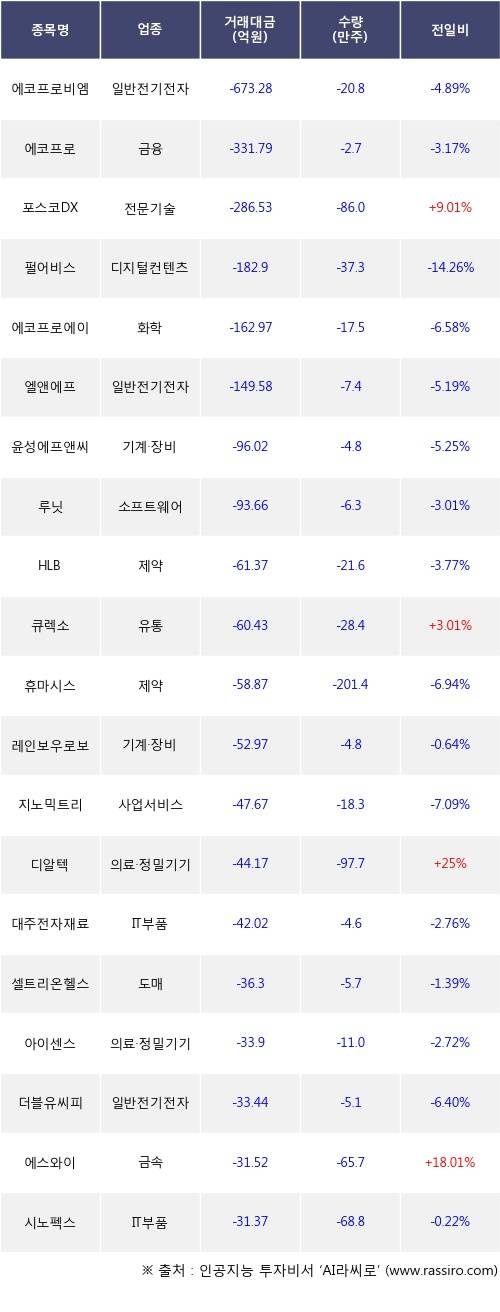 외국인 투자자의 순매도 상위 20개 종목은 에코프로비엠, 에코프로, 포스코DX, 펄어비스, 에코프로에이치엔, 엘앤에프, 윤성에프앤씨, 루닛, HLB, 큐렉소등이다.