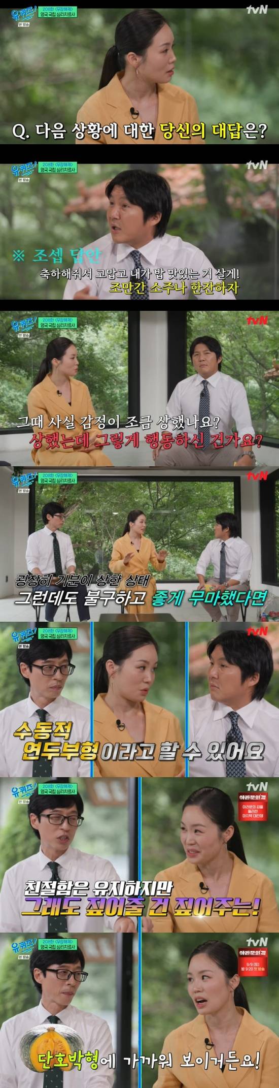 조세호는 "사실 유쾌하진 않다"라며 말했고, 안젤라 센은 "기분이 상했는데 좋게좋게 무마를 한다면 '수동적 연두부형'이라고 할 수 있다. 상대의 공격을 허용하고 심지어 자기 자신을 자기가 공격하는 거다. '왜 가만히 있었어' 집에서 이불킥하고. 다른 특징들은 지나치게 습관성 사과를 할 때도 있다. 말을 할 때 너무 숙이고 가는 경향이 있다"라며 분석했다.