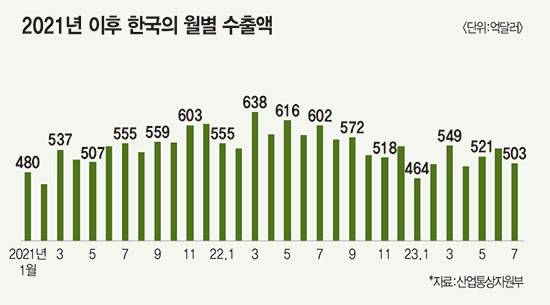 지난해 수출 추이를 훑어보자. 상반기만 해도 상당히 호조세를 보였다. 3월과 5월은 600억달러를 넘어섰다. 전년 동기 대비 증감률도 대단했다. 2021년 3월부터 줄곧 두 자릿수 성장률을 보였다. 지난해 2월과 5월은 성장률이 20%대를 기록했다.