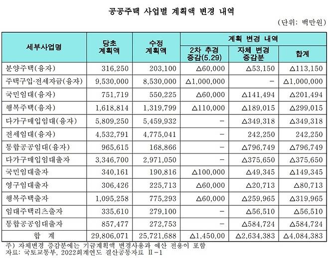 2022년 국토교통부의 주택도시기금에서 공공 주택공급 16개 사업의 결산을 보면 임대주택 건설을 위한 예산이 당초 계획액 대비 4조1000억원이 2차 추가경정예산, 자체 변경 등으로 감액돼 집행됐다.