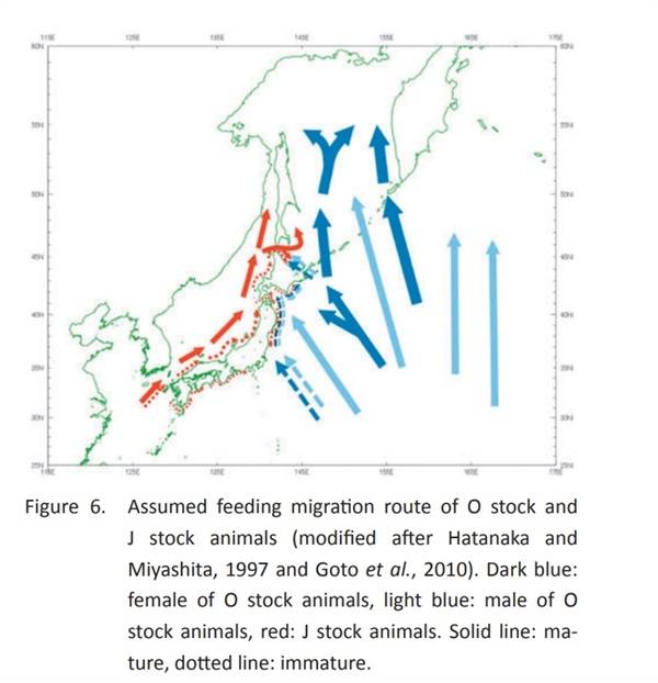 고토 무쓰오 등이 국제포경위원회에 발표한 2017년 논문 <유전자검사를 통한 일본 해역 밍크고래 O계군과 J계군의 분포와 이동 경로>에 나온 이 지도 역시 한반도와 일본 해역을 넘나드는 밍크고래의 회유 경로를 잘 보여준다. 붉은색으로 표시된 점선은 밍크고래 한반도계군의 미성숙 개체들의 이동 경로인데 계절에 따라 후쿠시마 해역에서 동해, 남해, 제주해역을 넘나들며 이동한다는 것을 보여준다.