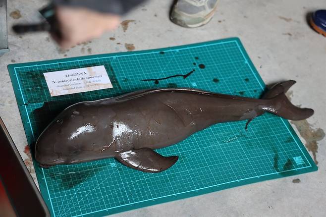 | ▲ 제주시 구좌읍 하도리에서 2021년 3월 31일 발견된 상괭이 사체를 부검하고 있다. |