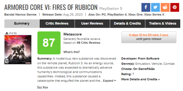 ■ 아머드 코어6 루비콘의 화염 메타크리틱 주요 리뷰 요약