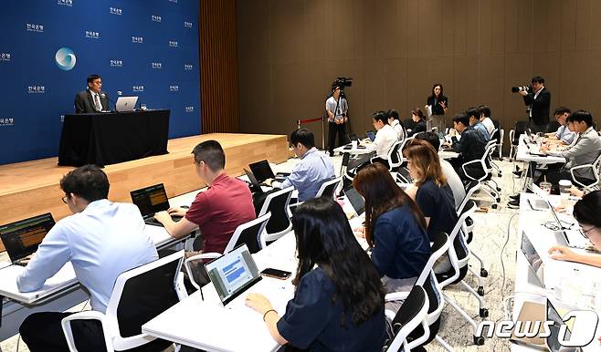 (서울=뉴스1) 사진공동취재단 = 이창용 한국은행 총재가 24일 서울 중구 한국은행에서 8월 금통위 금리 결정에 대한 기자간담회를 하고 있다.