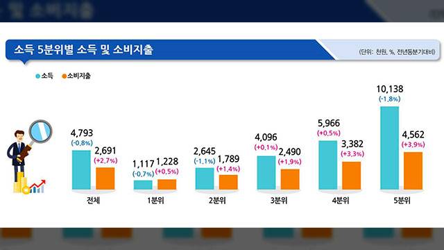 소득 분위별로 보면 상대적 저소득 가구인 1분위 가구와 2분위, 3분위에서는 근로소득이 전년보다 줄었고 상대적 고소득 가구인 4, 5분위는 사업소득이 감소했습니다.