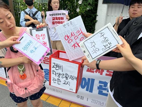 기자회견은 '교원의 학생생활지도에 관한 고시'에 '학생인권', '사생활 자유', '평화로운 학교' 등이 쓰인 휴대전화가 압수되는 퍼포먼스로 마무리되었다.