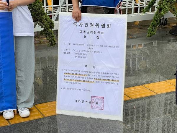 지난 23일 교육부가 2학기 시행을 예정하고 있는 '교원의 학생생활지도에 관한 고시' 철회를 요구하고 국가인권위원회에 진정하는 기자회견이 열렸다. 이번 기자회견은 2021년 '과도한 스마트폰 사용제한은 인권침해'를 이유로 국가인권위원회에 진정했던 지평선고 졸업생과 18개의 교육·인권단체가 주최했다.