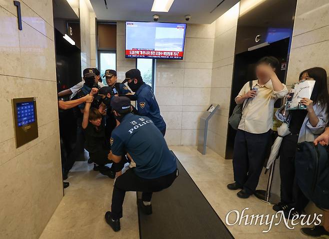 | ▲ 일본대사관이 입주한 8층에 들어간 대학생들을 연행하기 위해 경찰들이 승강기를 기다리는 가운데, TV에는 후쿠시마 오염수 방류 속보가 방송되고 있다. |