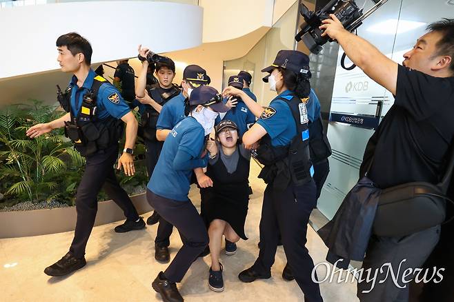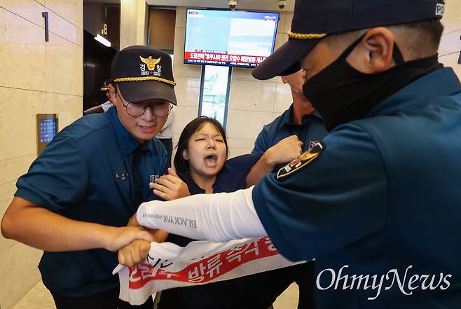 일본 대사관이 입주한 8층에서 농성하던 대학생들이 강제연행되는 가운데, TV에는 오염수 방류 개시 속보가 나오고 있다.