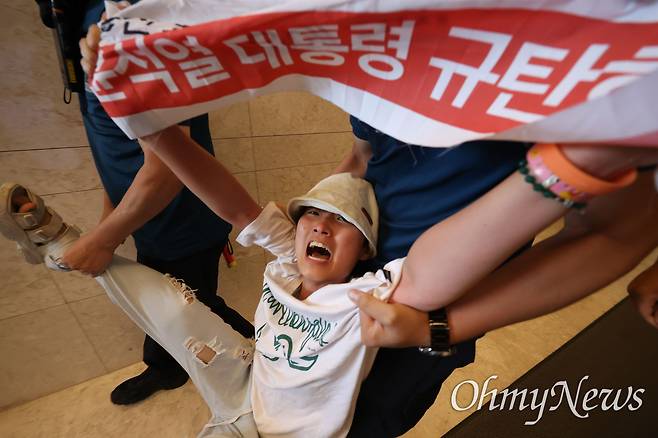 | ▲ 윤석열 대통령 규탄 피켓을 들고 구호를 외치며 연행되는 대학생. |