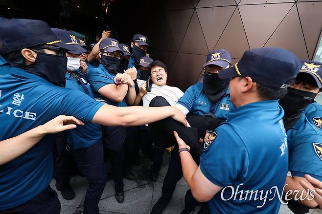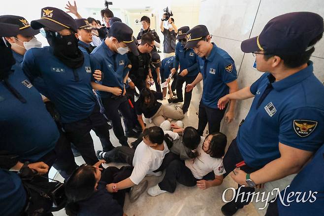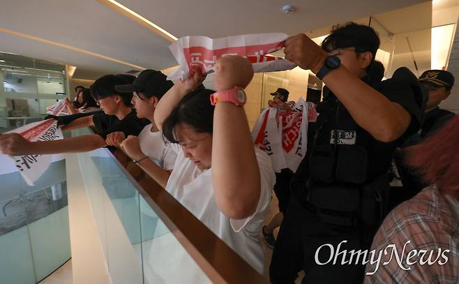 | ▲ 대학생들이 들고 있는 현수막과 손피켓을 경찰이 뺏고 있다. |