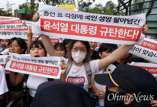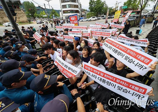- 일본대사관 기습 대학생들 "오염수 투기 중단, 한마디도 못한 윤석열"