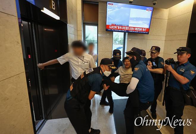 | ▲ 일본대사관이 입주한 8층에서 농성하던 대학생들이 강제연행되는 가운데, TV에는 오염수 방류 속보가 나오고 있다. |