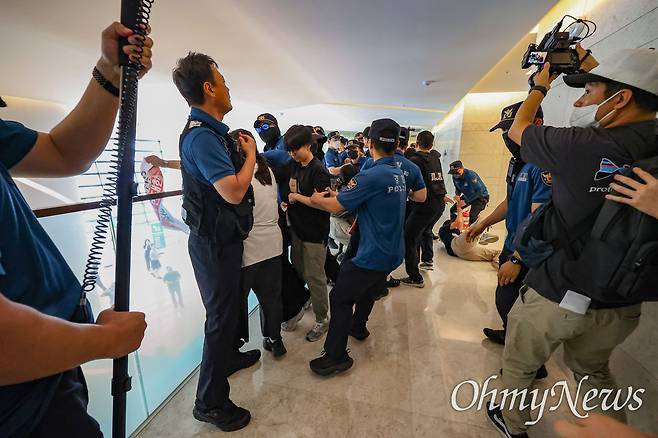 | ▲ 일본대사관 입주 빌딩 로비에서 기습시위를 벌이던 대학생들이 강제연행되고 있다. |