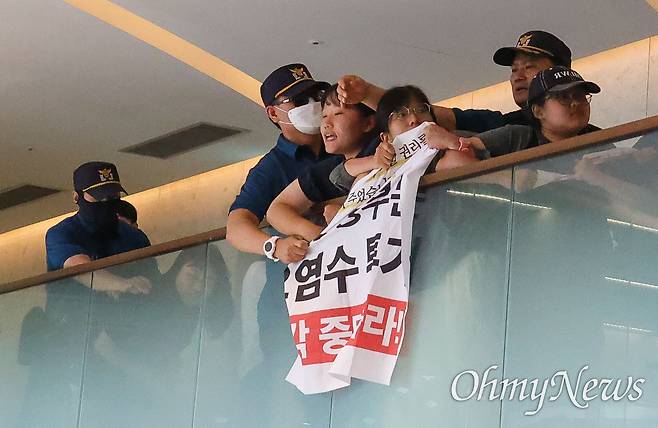 [오마이포토] "바다가 쓰레기통이냐" 일본대사관 빌딩 안 기습시위