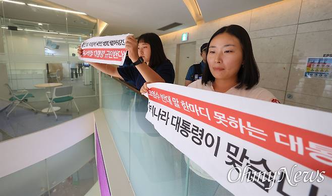 | ▲ ‘바다는 일본의 쓰레기통이 아니다’ ‘일본정부는 오염수 투기 즉각 중단하라’ ‘총선 표 걱정에 국민 생명 팔아넘긴 윤석열 대통령 규탄한다’ ‘오염수 반대 말 한마디 못하는 대통령, 우리나라 대통령 맞습니까’ 등이 적힌 손피켓을 든 대학생들이 일본대사관이 입주한 빌딩에서 기습시위를 벌이고 있다. |