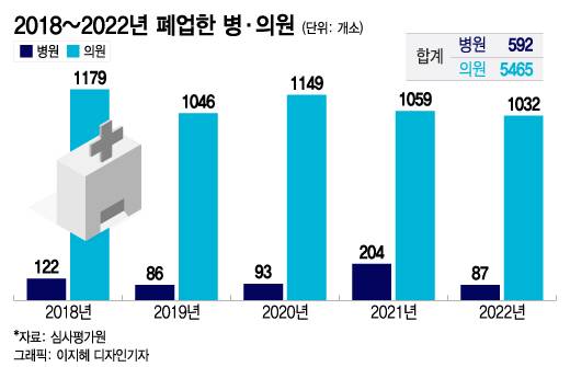 우리나라에서는 해마다 약 1000여곳의 의원이 폐업한다. 병원도 1년마다 약 100여곳이 폐업한다. 건강보험심사평가원에 따르면 2018년부터 지난해까지 폐업한 병원은 592곳, 의원은 5465곳이다.