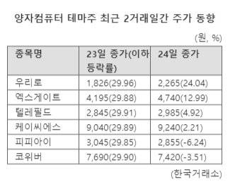 이들 기업은 모두 '양자컴퓨터' 테마 현상에 편승해 전일 상한가를 기록한 바 있다. 국내 한 연구진이 상온에서 대규모 '양자 얽힘' 현상을 구현할 수 있는 양자 소재 후보물질을 확인했다고 밝히면서 투자심리가 몰렸다.