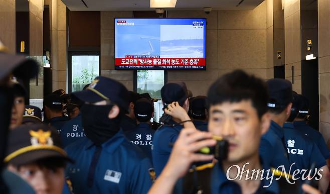 | ▲ 24일 오후 일본대사관이 입주한 건물 8층에 들어간 대학생들을 연행하기 위해 경찰들이 승강기를 기다리는 가운데, TV에는 후쿠시마 오염수 방류 속보가 방송되고 있다. |