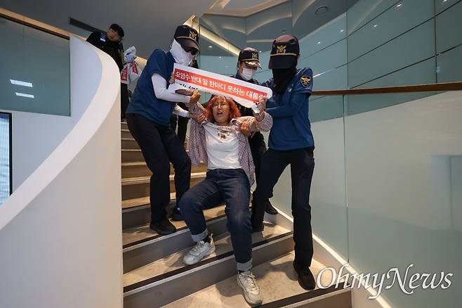 학생들의 구호와 비명, 경찰들의 고함 등으로 현장은 순식간에 아수라장이 됐다. 경찰에게 사지가 들린 상태로 1층 로비에 끌려 나온 한 학생은 "일본 정부 규탄한다! 한국 정부는 일본에 국민 생명을..."이라며 말을 잇지 못했다. 경찰에게 양팔이 붙들린 채 끌려 나오던 학생들도 "오염수 투기 규탄한다!", "윤석열 정부 규탄한다!"라고 외쳤다.