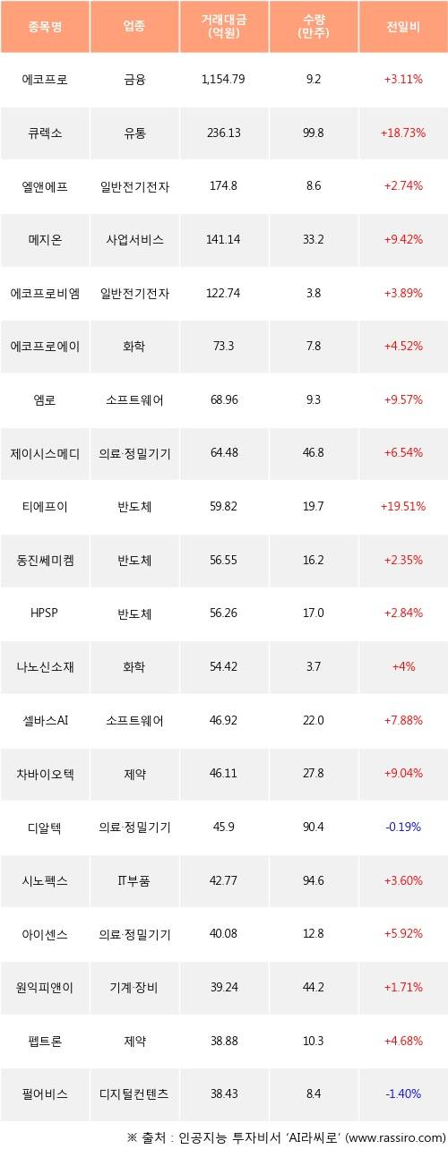 외국인 투자자의 순매수 상위 20개 종목은 에코프로, 큐렉소, 엘앤에프, 메지온, 에코프로비엠, 에코프로에이치엔, 엠로, 제이시스메디칼, 티에프이, 동진쎄미켐등이다.