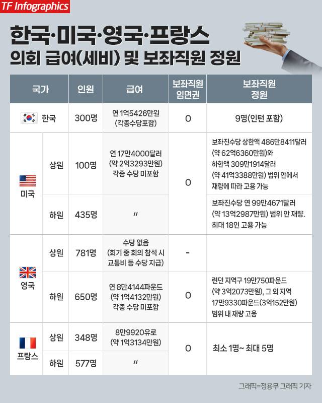 프랑스 의회는 상원 348명, 하원 577명의 의원으로 구성됐다. 상하원 의원의 연봉은 지난해 7월 1일 기준 8만9920유로(약 1억3134만 원)로, 한국 국회의원 세비와 비슷한 수준이다. 의장, 상임위원회 위원장 등에는 직책별로 추가 수당이 지급된다. 이 외에도 의원이 공적 업무를 수행하는 데 드는 비용 중 의회가 보전해주지 않는 일체의 경비를 지원하기 위한 수당인 운영경비수당이 매월 약 5770유로(약 842만 원)가 지급되며, 통신수당과 퇴직수당 등도 지원된다.