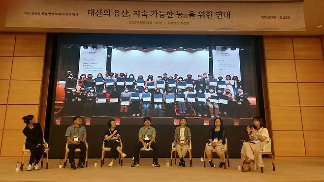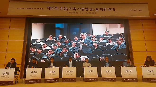 | ▲ 농촌 심포지엄 토론 대산농촌재단이 24일 연 '지속 가능한 농을 위한 연대' 심포지엄 종합토론에서 한 참석자가 질문하는 모습이 화면에 비치고 있다. 무대 앞에는 왼쪽부터 발제자 3인과 사회자, 지정토론자들이 앉아있다. |