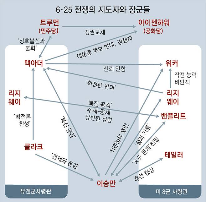 한국을 관할하는 미국 사령관과 이승만 대통령은 서로 껄끄러운 일이 많았다. 인간적인 요소가 작용할 때도 있었지만 주로는 서로의 지위와 역할이 달랐기 때문이다. 점령군 사령관 하지 중장은 이승만 대통령을 상대하는 것은 끔찍한 일이었다고 회고했다. 워커는 개전 초기 낙동강까지 밀려만 가는 것에 이승만은 불만을 나타냈다. 북진과 통일에 모두 거부감을 가졌던 리지웨이와는 ‘물과 기름’이었다.