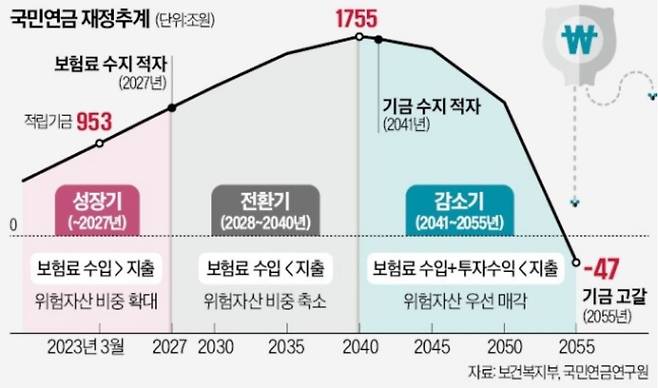 지난 3월 정부가 내놓은 국민연금 장기 재정 전망에 따르면 보험료율 9%, 소득대체율 40%인 현행 제도가 유지될 경우 국민연금기금은 2040년 1755조원으로 정점을 찍은 뒤 이듬해 적자로 전환해 2055년 완전 고갈된다.
