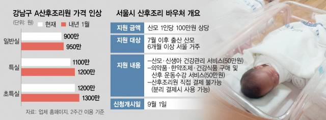 서울시가 다음 달부터 1명당 100만 원의 산후조리 바우처를 지급하면 가격 인상 경쟁이 심각해질 수 있다는 우려가 나온다. 앞서 출산 지원비를 지급한 자치구에서는 물가 인상과 리모델링을 이유로 산후조리비 지원금 액수만큼 이용 요금을 올리는 사례들이 목격됐다.