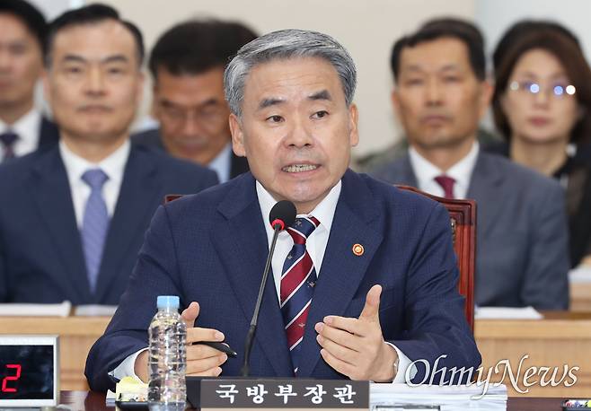 | ▲ 이종섭 국방부 장관이 25일 서울 여의도 국회에서 열린 국방위원회 전체회의에서 의원 질의에 답변하고 있다. |