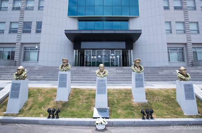 | ▲ 2018년 6월 8일 오후 서울 노원구 육군사관학교에 설치된 신흥무관학교 설립자 이회영 선생과 항일 독립운동에 일생을 바친 홍범도·김좌진·지청천·이범석 장군 등의 흉상에 신흥무관학교 107주년을 맞아 꽃목걸이가 걸려 있다. |
