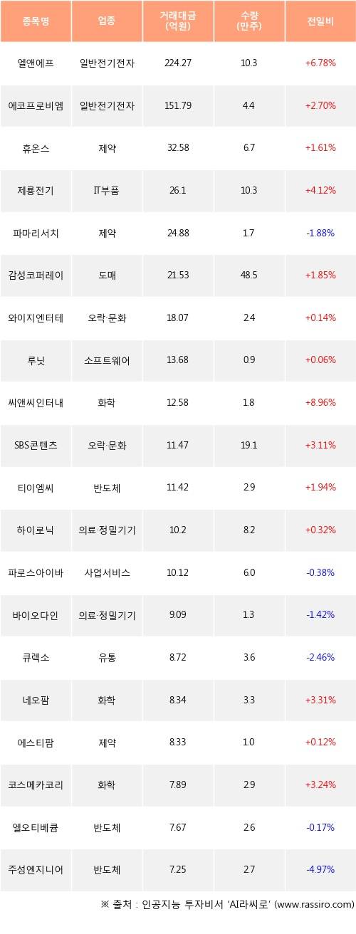 기관 투자자의 순매수 상위 20개 종목은 엘앤에프, 에코프로비엠, 휴온스, 제룡전기, 파마리서치, 감성코퍼레이션, 와이지엔터테인먼트, 루닛, 씨앤씨인터내셔널, SBS콘텐츠허브등이다.