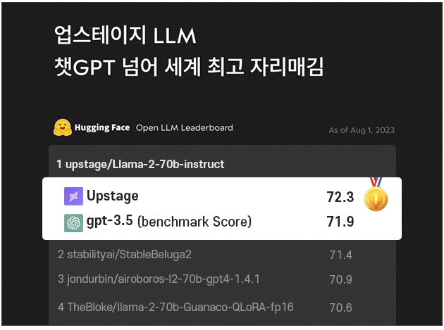 Q. 반갑습니다. 대표님. 먼저 업스테이지가 허깅페이스 LLM에서 (8월 1일 기준) 1위를 했는데요. 어떤 의미인지 설명해 주실 수 있을까요?