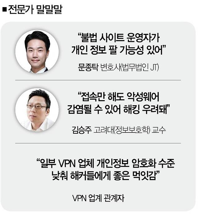 문제는 회원 가입했을 때 자신의 개인정보가 어떻게 쓰일지 접속자로선 알 길이 없다는 점입니다. 아이디와 패스워드가 대표적입니다. 문종탁 변호사(법률사무소 JT)의 말을 들어보시죠. "접속자는 불법 사이트 회원가입 시 아이디·비밀번호 입력란에 평소 자신이 타 사이트에서 써 오던 걸 입력할 가능성이 높다. 그 때문에 불법 사이트 회원 정보는 암암리에 비싸게 팔린다. 불법 사이트 운영자가 이를 모를 리 없다."
